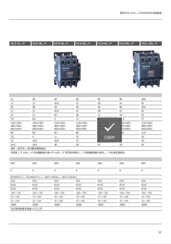 霍尼韋爾 HCS-...-P 系列三極交流接觸器