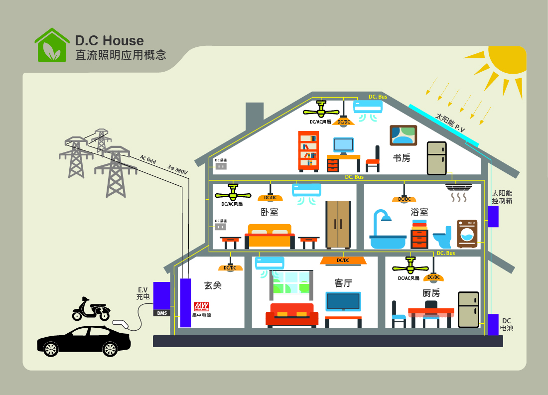 由于再生能源已是未來發(fā)展趨勢,因此DC House不再只是一個(gè)概念,而是必要的基礎(chǔ)設(shè)施。因此,如何提高電力轉(zhuǎn)換效能在交流電轉(zhuǎn)換直流電,或直流電轉(zhuǎn)換交流電都是不可忽視的議題。明緯將以此為出發(fā)點(diǎn),引領(lǐng)成為直流供電室內(nèi)應(yīng)用先驅(qū),定義新的直流集中供電照明應(yīng)用方式,以達(dá)到降低功率轉(zhuǎn)換過程的損失。