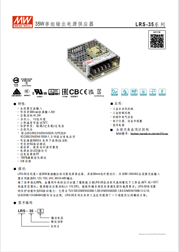 瓦數(shù): 35W~350W 功能特性 無PFC功能,經(jīng)濟型機型 小型化及1U低高度(30mm)