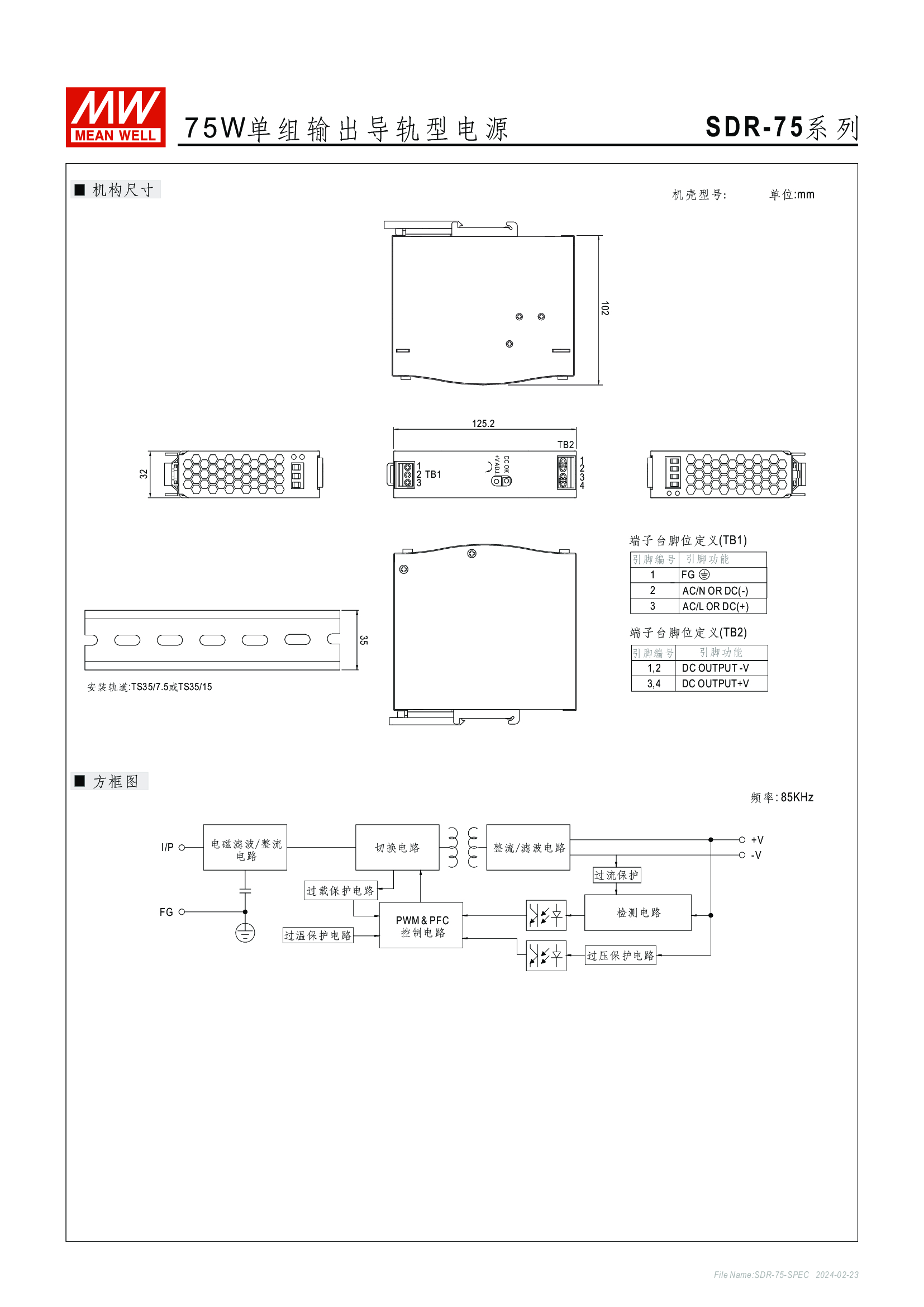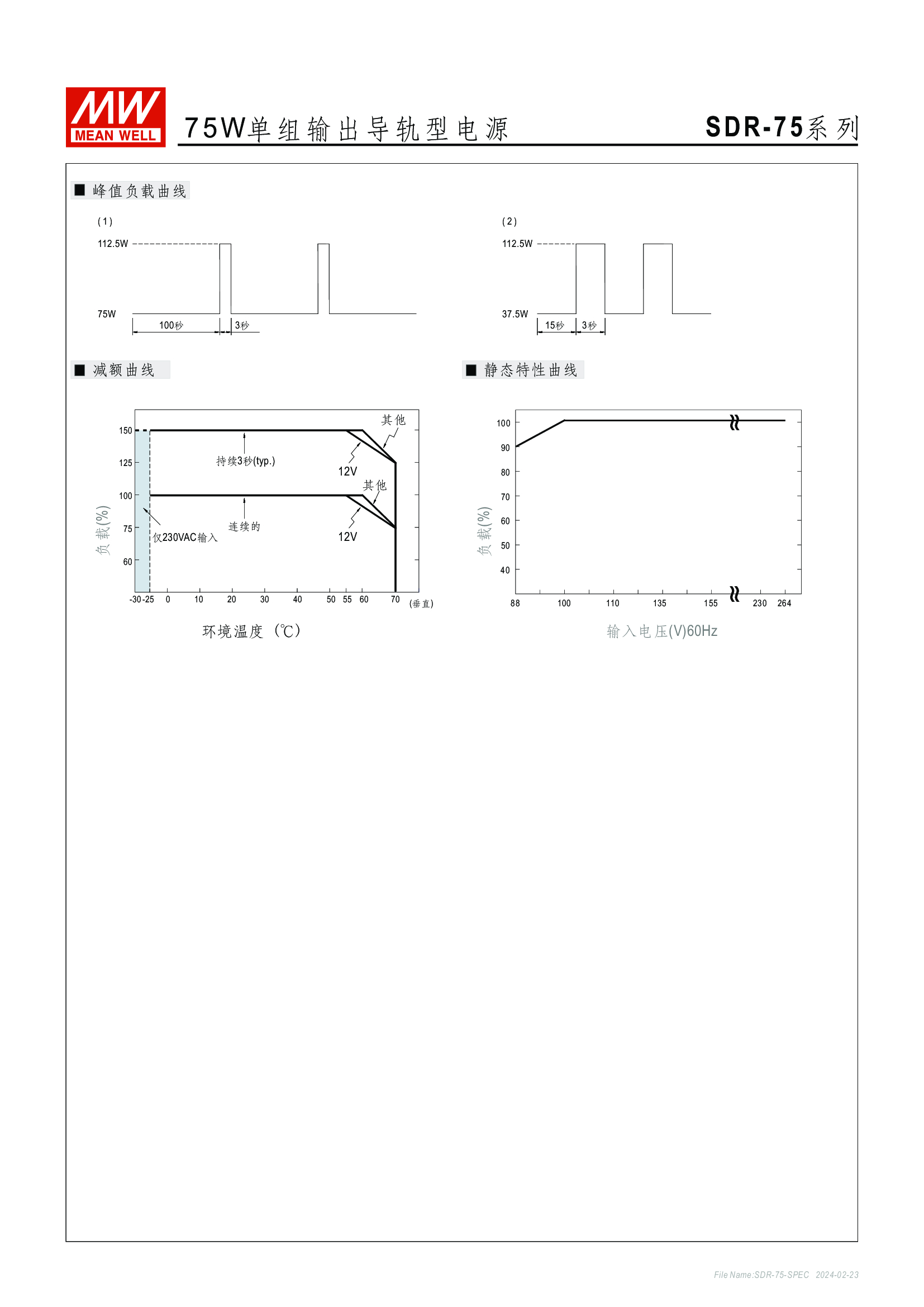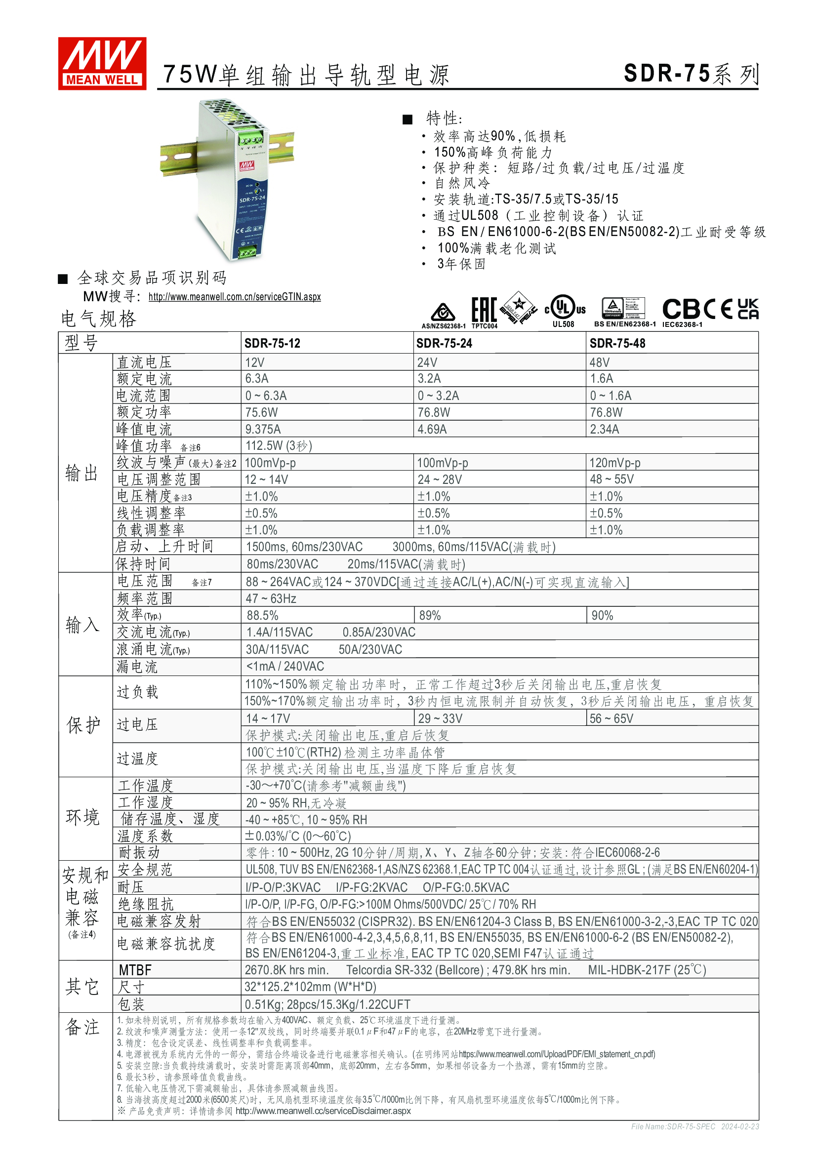 金屬殼,薄型設(shè)計 單相,全范圍輸入 (SDR-960:230VAC) 94%高效率, 完整功能 內(nèi)建主動式功率因子矯正功能(active PFC) (SDR-75除外) 適合安裝于DIN rail TS-35 / 7.5 或 15 內(nèi)建DC OK繼電器接點(Relay contact) (SDR-75除外) 可提供130%~150%峰值負載輸出(依機型) 并聯(lián)功能(SDR-480P/960)