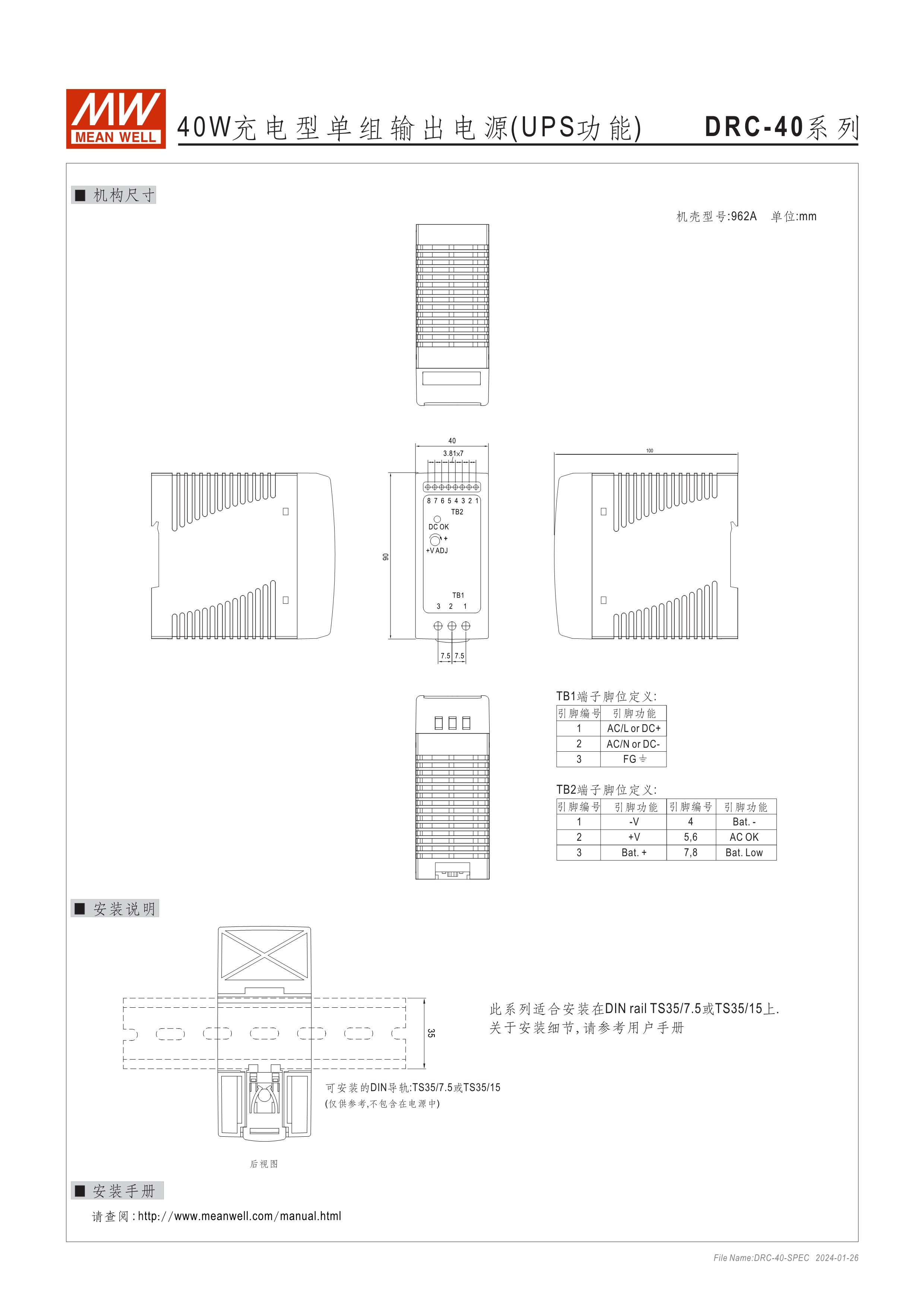 具UPS 功能(需外接電池) 適合用于安全監(jiān)控設(shè)備或各式電池備援系統(tǒng) 適合安裝于DIN rail TS35 / 7.5 或 15
