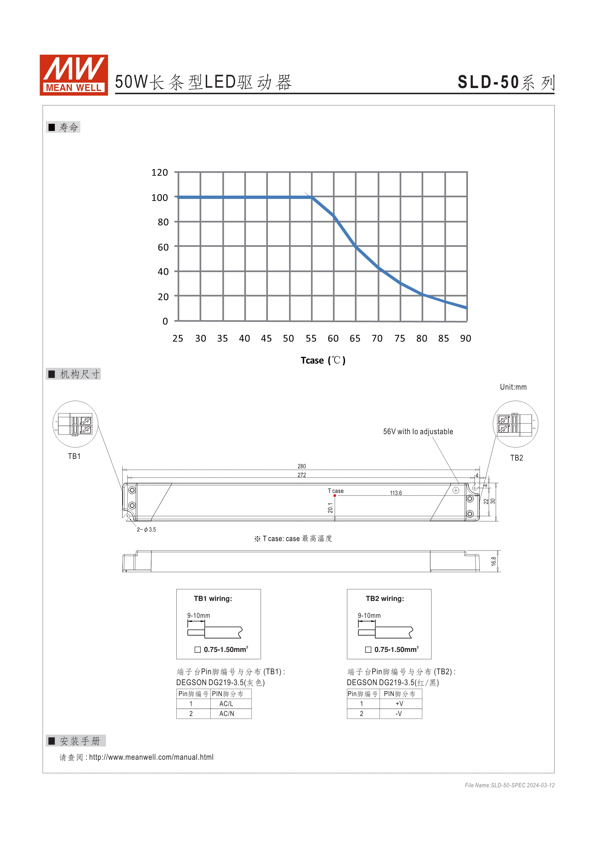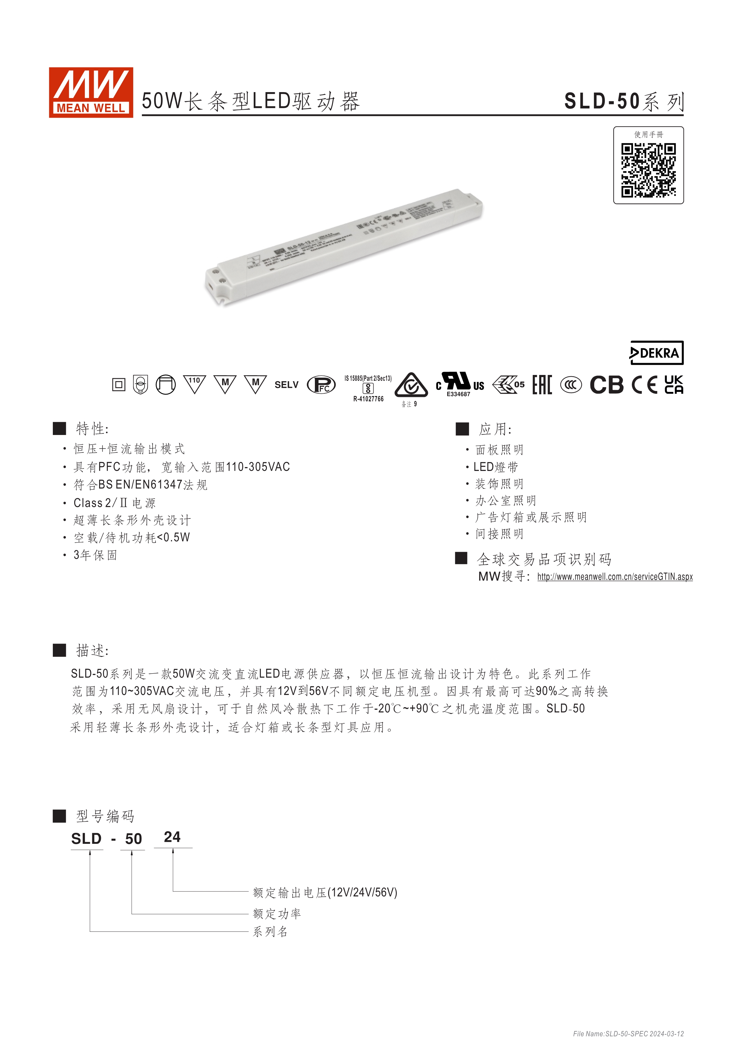 寬電壓輸入范圍110~305VAC (SLD-150為120~305VAC) 超薄(16.8mm)長(zhǎng)條型尺寸 主動(dòng)式PFC設(shè)計(jì)及輸出效率可達(dá)90% (SLD-150效率可達(dá)93%) 符合class 2/II 設(shè)計(jì)及SELV 保護(hù)功能:短路、過電壓、過溫度 3年保固 (SLD-150為5年保固)