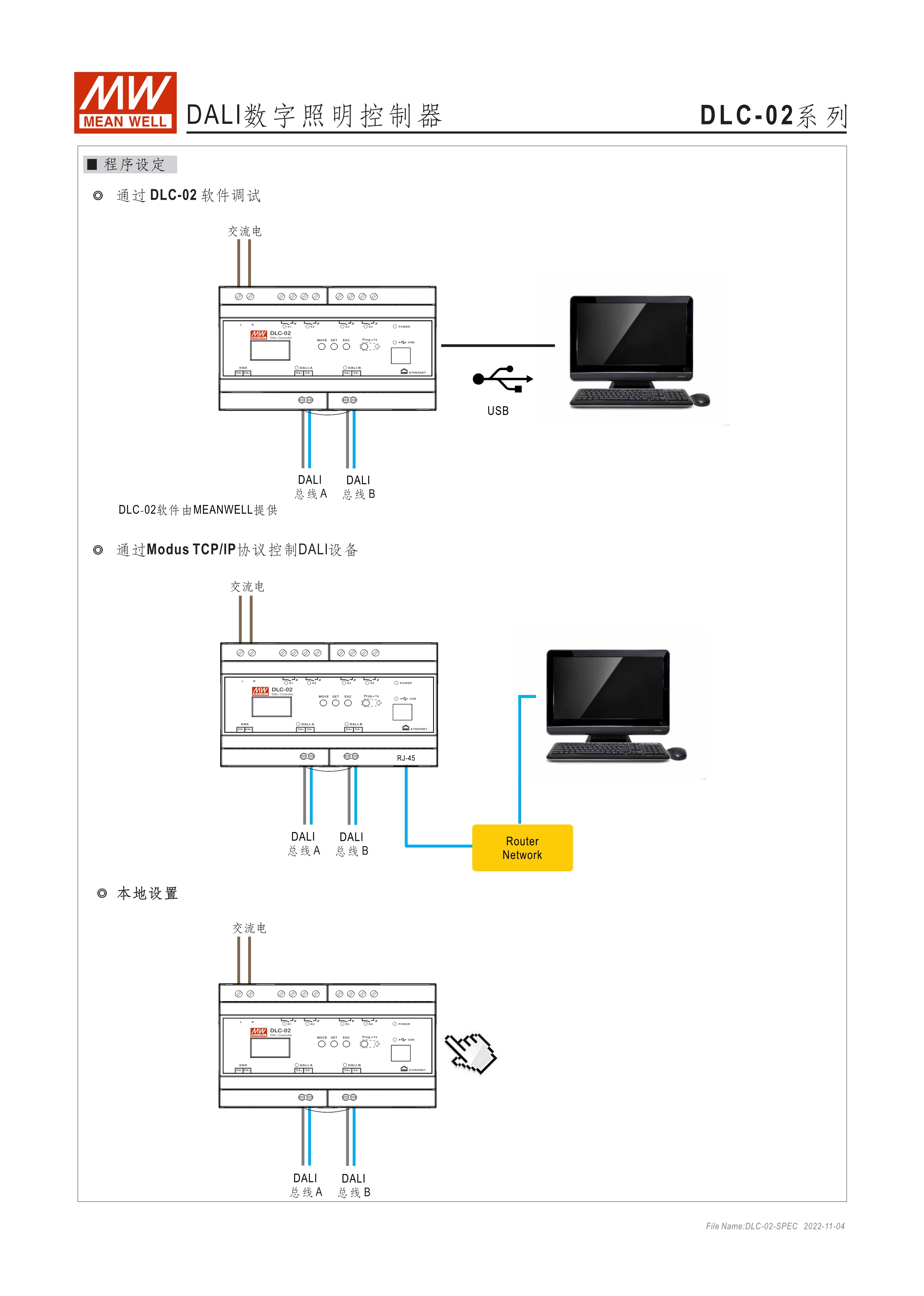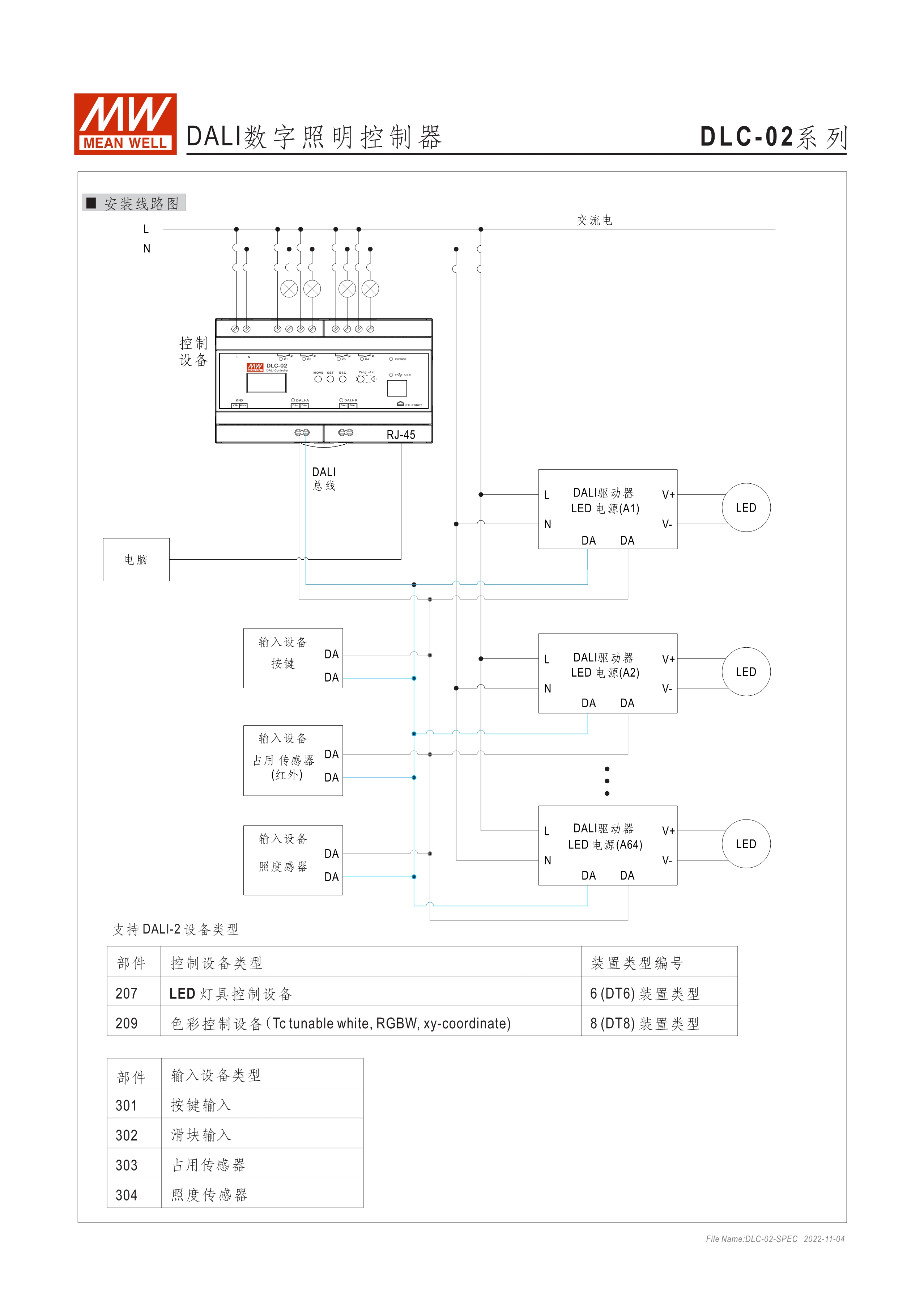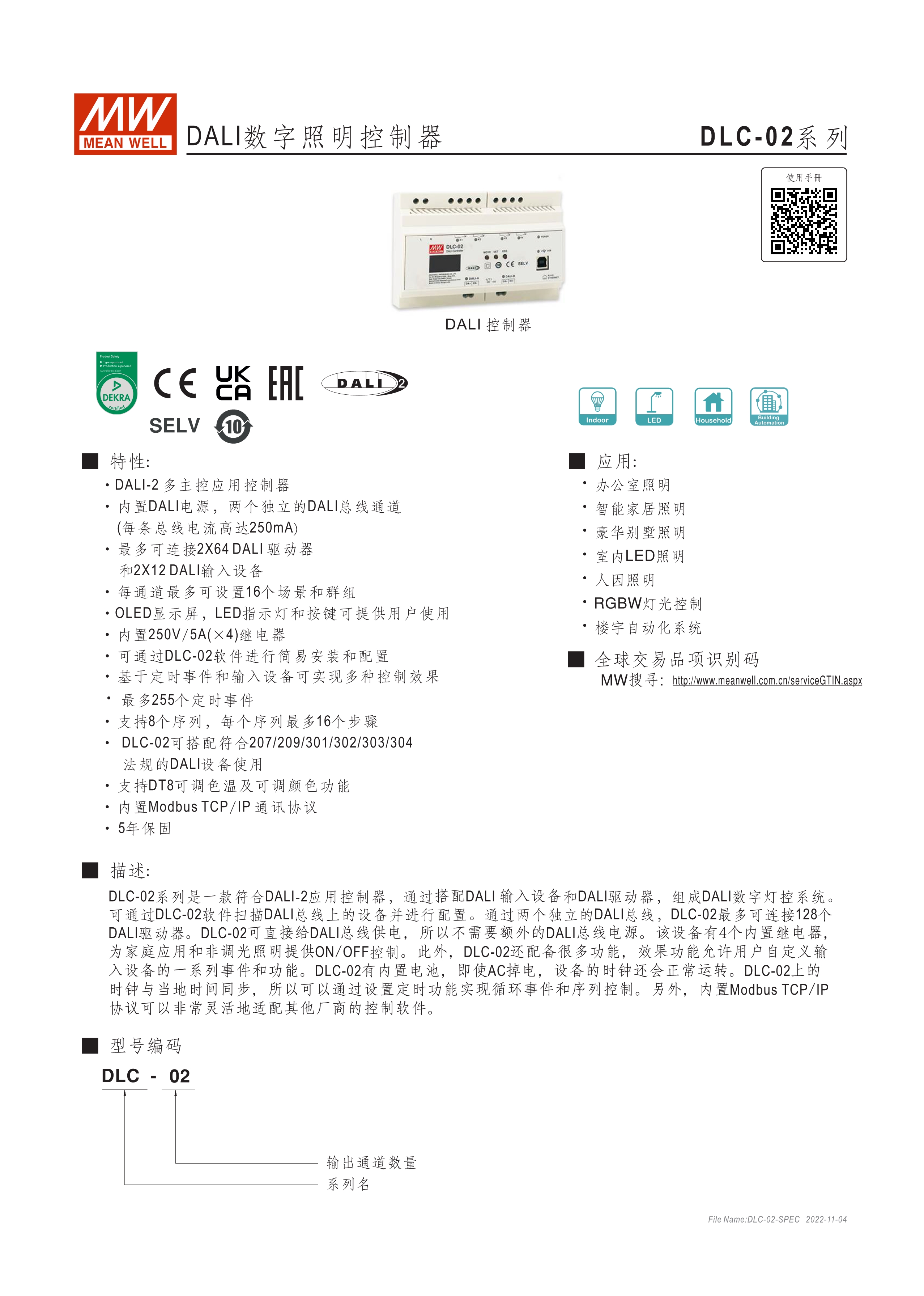 符合IEC 62386 DALI-2,Part 101/103/207/208/301/302/303/304標(biāo)準(zhǔn) 2組獨立DALI總線,可接Control Gear及Control Device搭配使用 4路可控繼電器,接觸容量5A,可當(dāng)電器開關(guān)或兩組電動窗簾使用 可搭配DLC軟體做現(xiàn)場系統(tǒng)設(shè)定,或透過網(wǎng)路線從遠(yuǎn)端做修改設(shè)定 透過本體液晶顯示螢?zāi)患安倏匕粹o,可做簡單設(shè)定和狀態(tài)查詢 內(nèi)建Timer晶片,可搭配DLC軟體做行程控制設(shè)定 通訊介面接口:RJ-45及KNX,可與其他樓宇自動化系統(tǒng)做連線擴充使用 采導(dǎo)軌式設(shè)計,體積小巧僅8SU寬度(144x 90x 58.4mm)