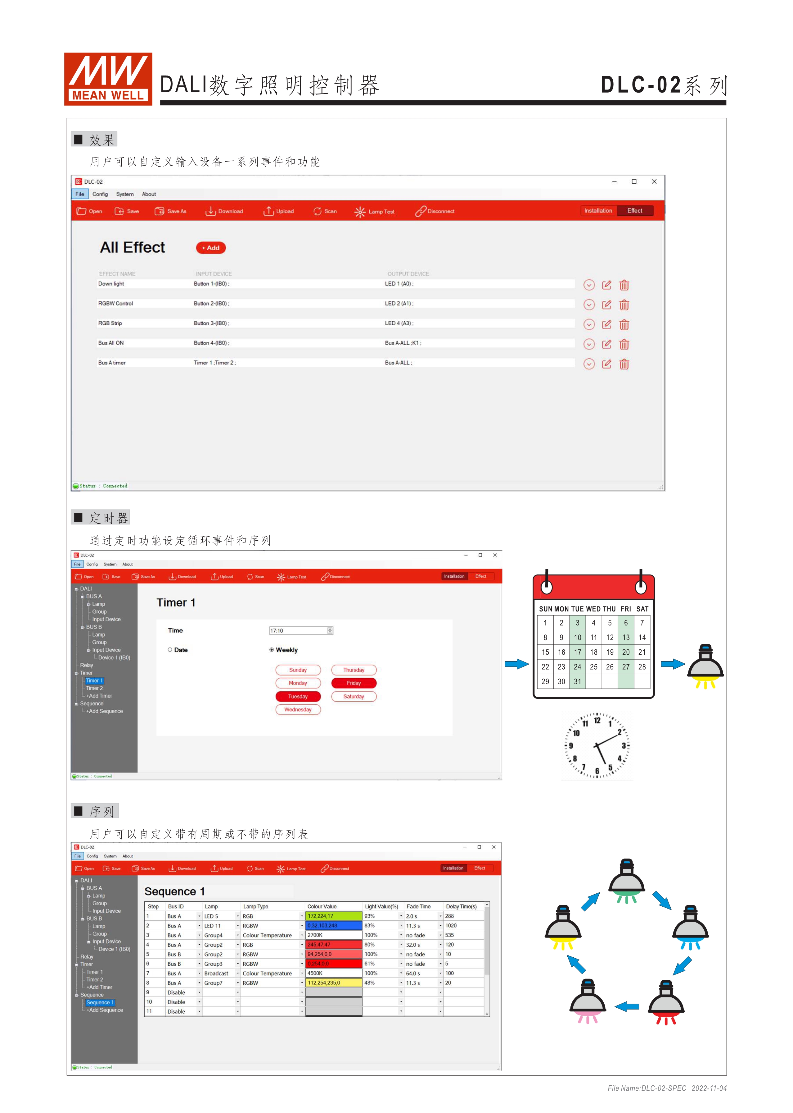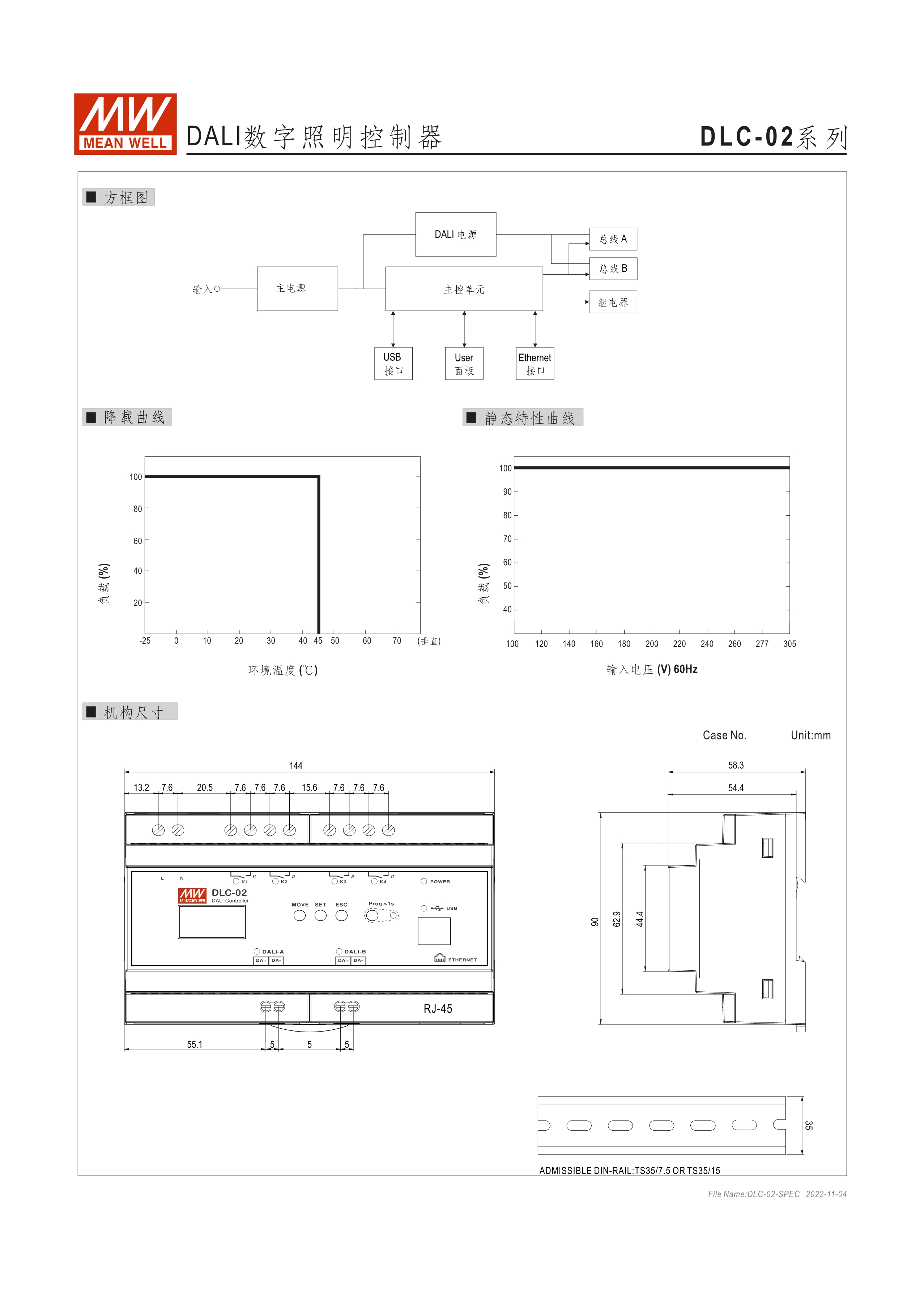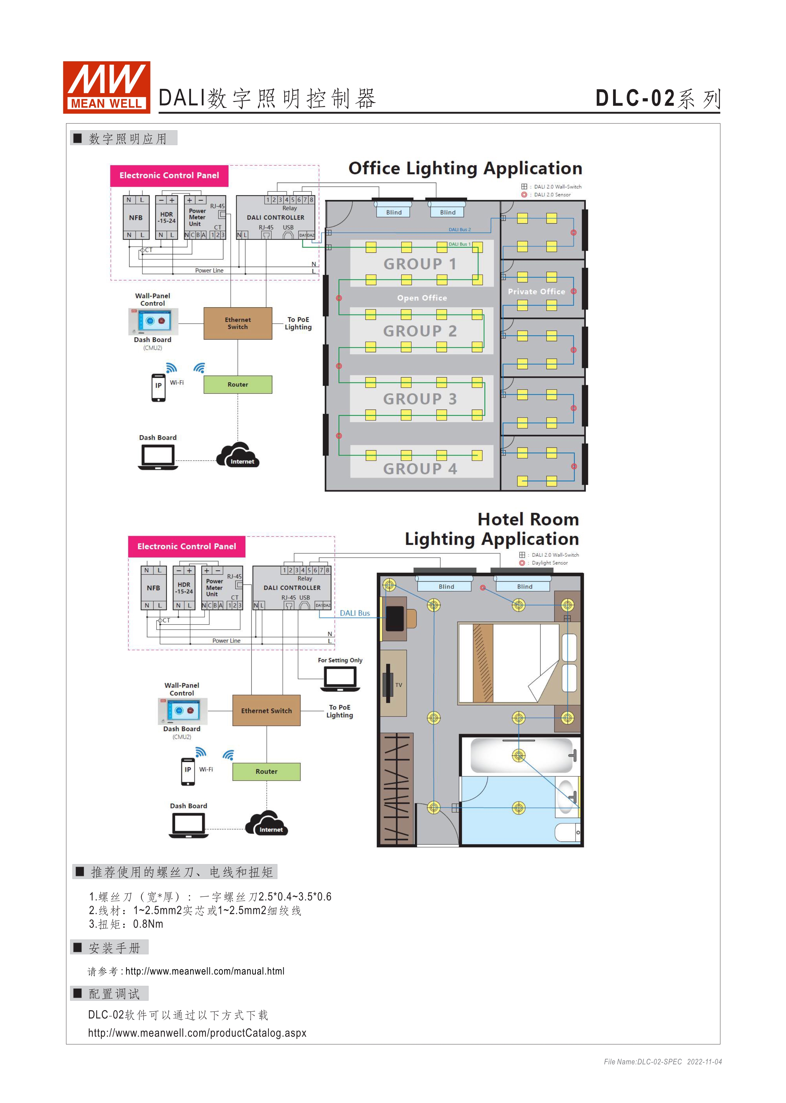 符合IEC 62386 DALI-2,Part 101/103/207/208/301/302/303/304標(biāo)準(zhǔn) 2組獨立DALI總線,可接Control Gear及Control Device搭配使用 4路可控繼電器,接觸容量5A,可當(dāng)電器開關(guān)或兩組電動窗簾使用 可搭配DLC軟體做現(xiàn)場系統(tǒng)設(shè)定,或透過網(wǎng)路線從遠(yuǎn)端做修改設(shè)定 透過本體液晶顯示螢?zāi)患安倏匕粹o,可做簡單設(shè)定和狀態(tài)查詢 內(nèi)建Timer晶片,可搭配DLC軟體做行程控制設(shè)定 通訊介面接口:RJ-45及KNX,可與其他樓宇自動化系統(tǒng)做連線擴充使用 采導(dǎo)軌式設(shè)計,體積小巧僅8SU寬度(144x 90x 58.4mm)