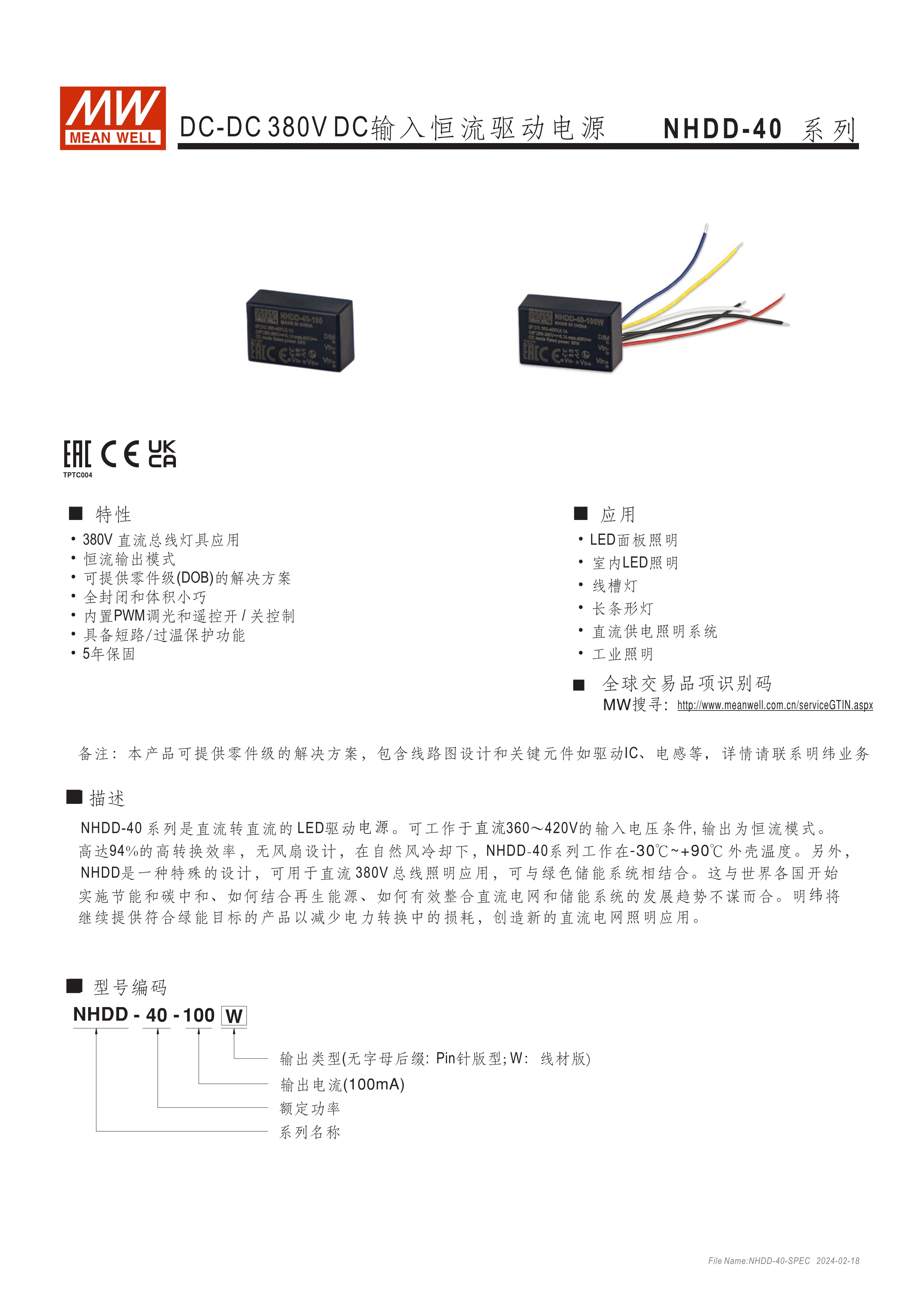 恒流模式輸出 為DC 380V BUS照明燈具提供電路板型(DoB)解決方案 塑料外殼和全封裝 內(nèi)建PWM和遠(yuǎn)程開(kāi)關(guān)控制 保護(hù):短路/過(guò)溫 5年保固