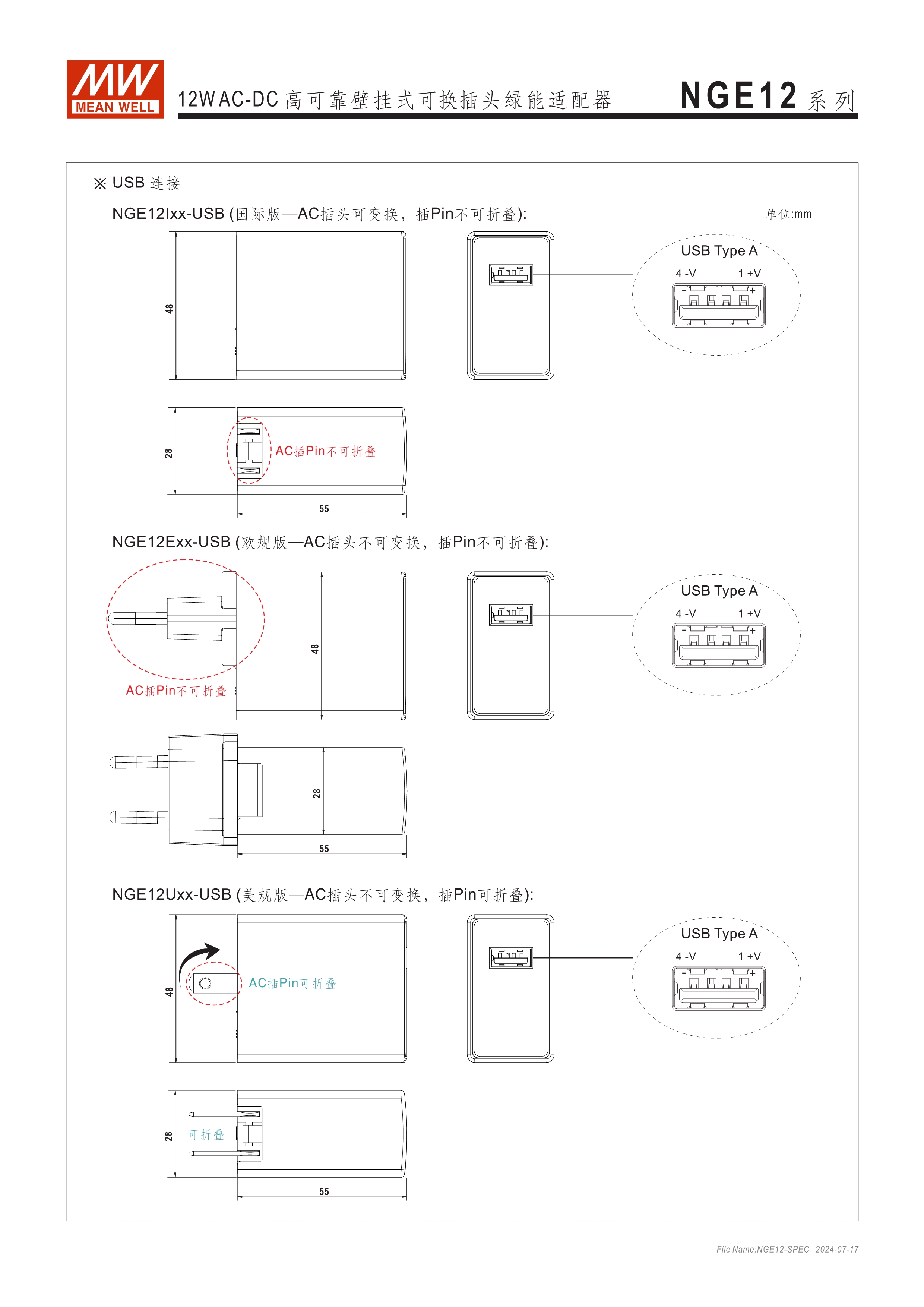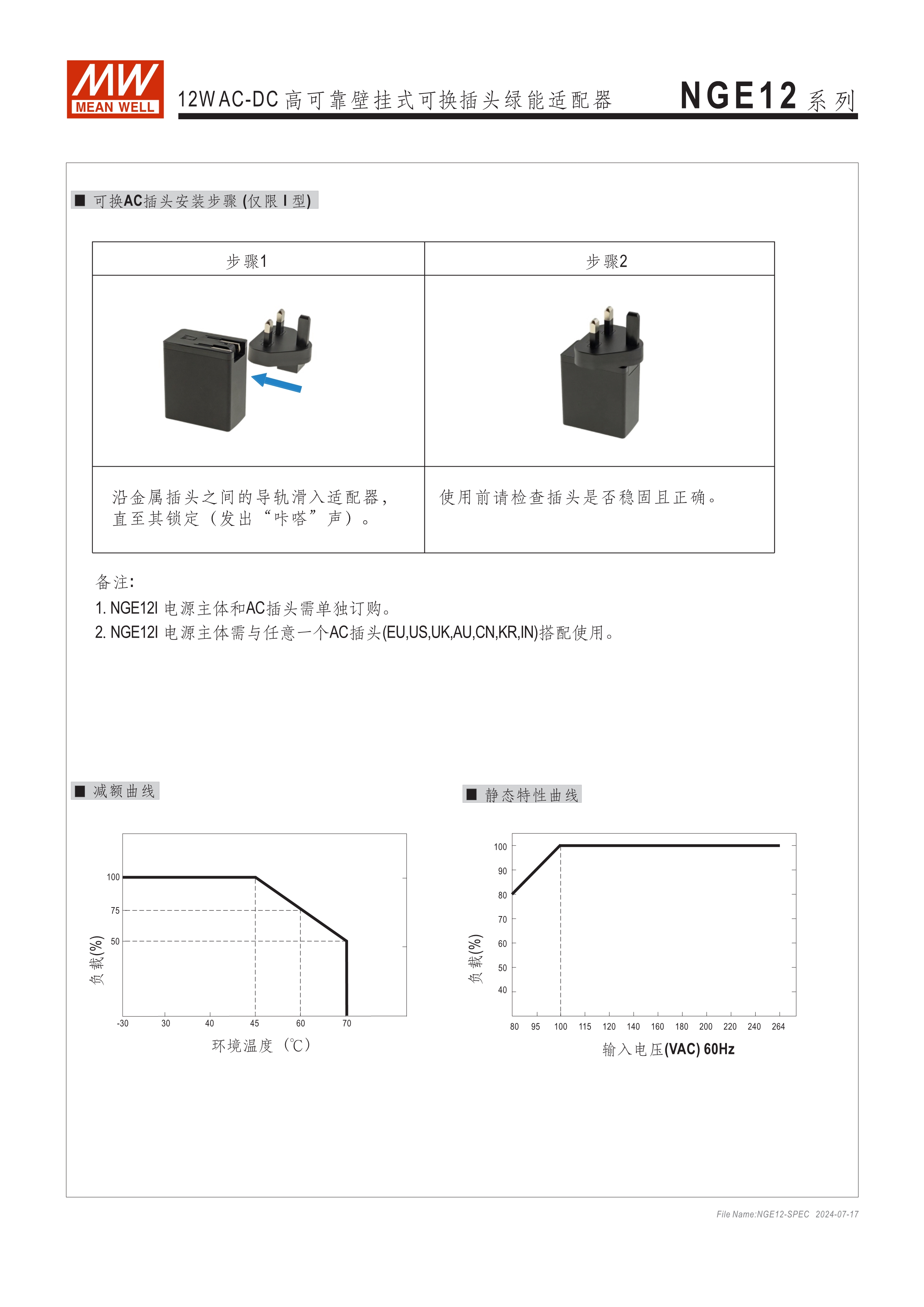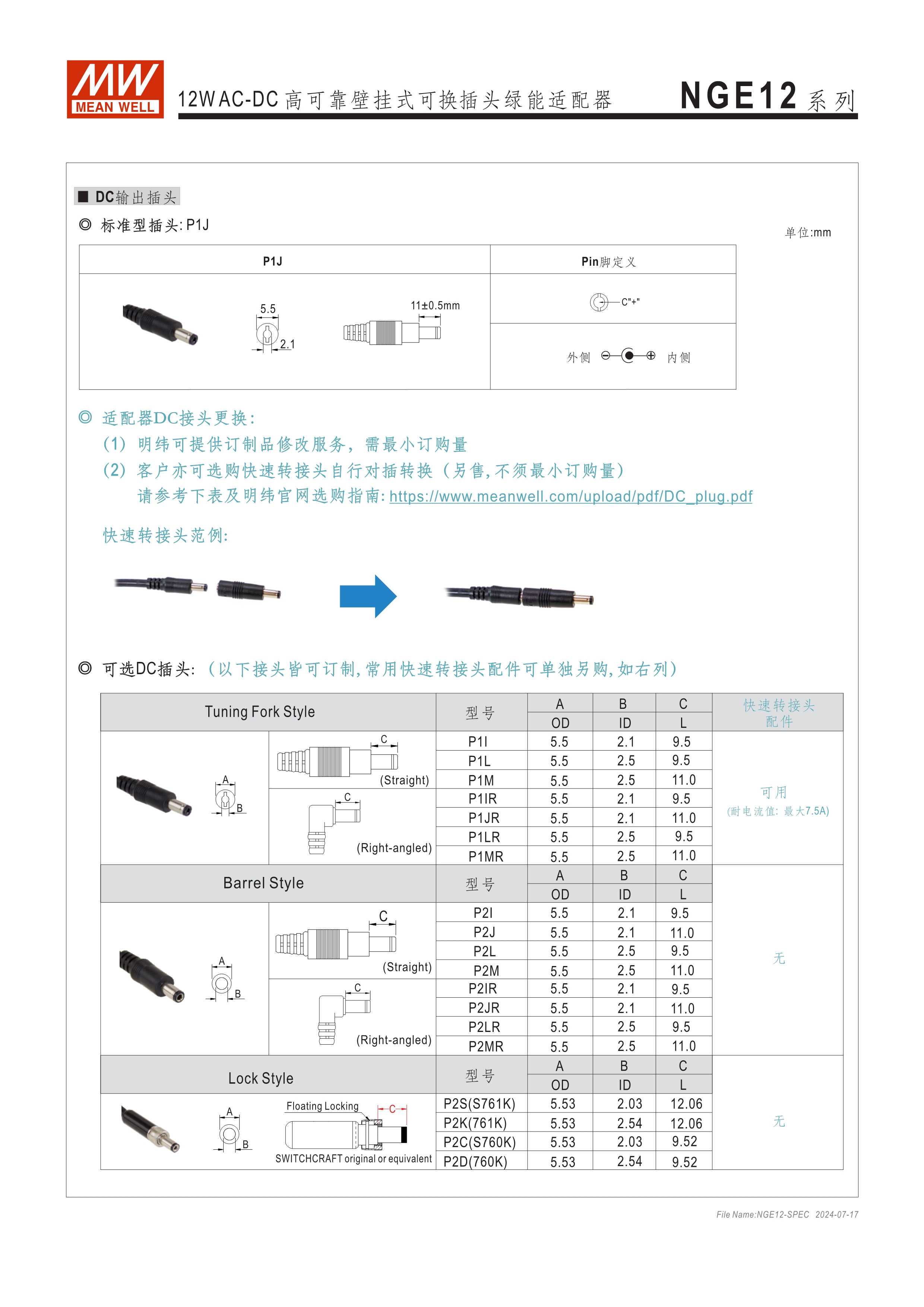 可換AC插頭 符合多領域全球認證 (信息類 62368-1、醫(yī)療 60601-1, 家用 60335-1、工業(yè) 61558-1/-2-16) 全范圍AC輸入 2xMOPP, BF應用 超窄面寬設計(28mm~30mm) 漏電流 <100uA 80~264V輸入 空載損耗<0.075W~0.1W 能效等級Level VII 保護功能:短路、過載、過電壓 漏電流 <100uA -30~70℃寬工作溫度 多種DC輸出轉接頭可更換 3年保固期