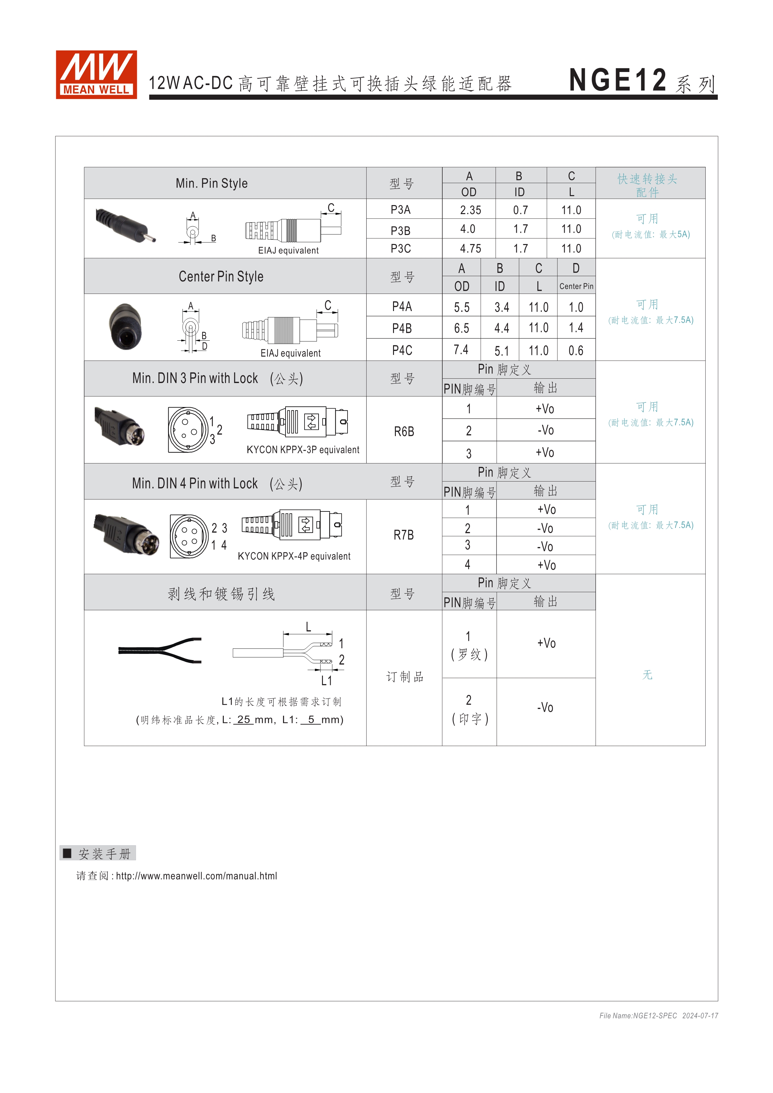 可換AC插頭 符合多領(lǐng)域全球認(rèn)證 (信息類(lèi) 62368-1、醫(yī)療 60601-1, 家用 60335-1、工業(yè) 61558-1/-2-16) 全范圍AC輸入 2xMOPP, BF應(yīng)用 超窄面寬設(shè)計(jì)(28mm~30mm) 漏電流 <100uA 80~264V輸入 空載損耗<0.075W~0.1W 能效等級(jí)Level VII 保護(hù)功能:短路、過(guò)載、過(guò)電壓 漏電流 <100uA -30~70℃寬工作溫度 多種DC輸出轉(zhuǎn)接頭可更換 3年保固期