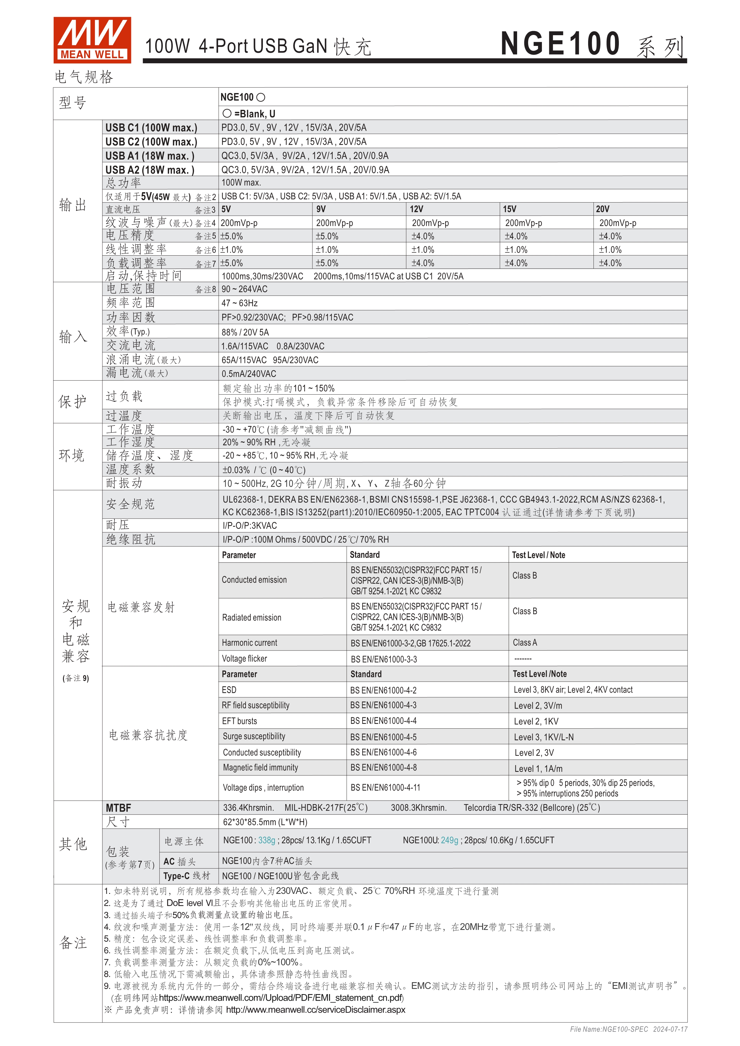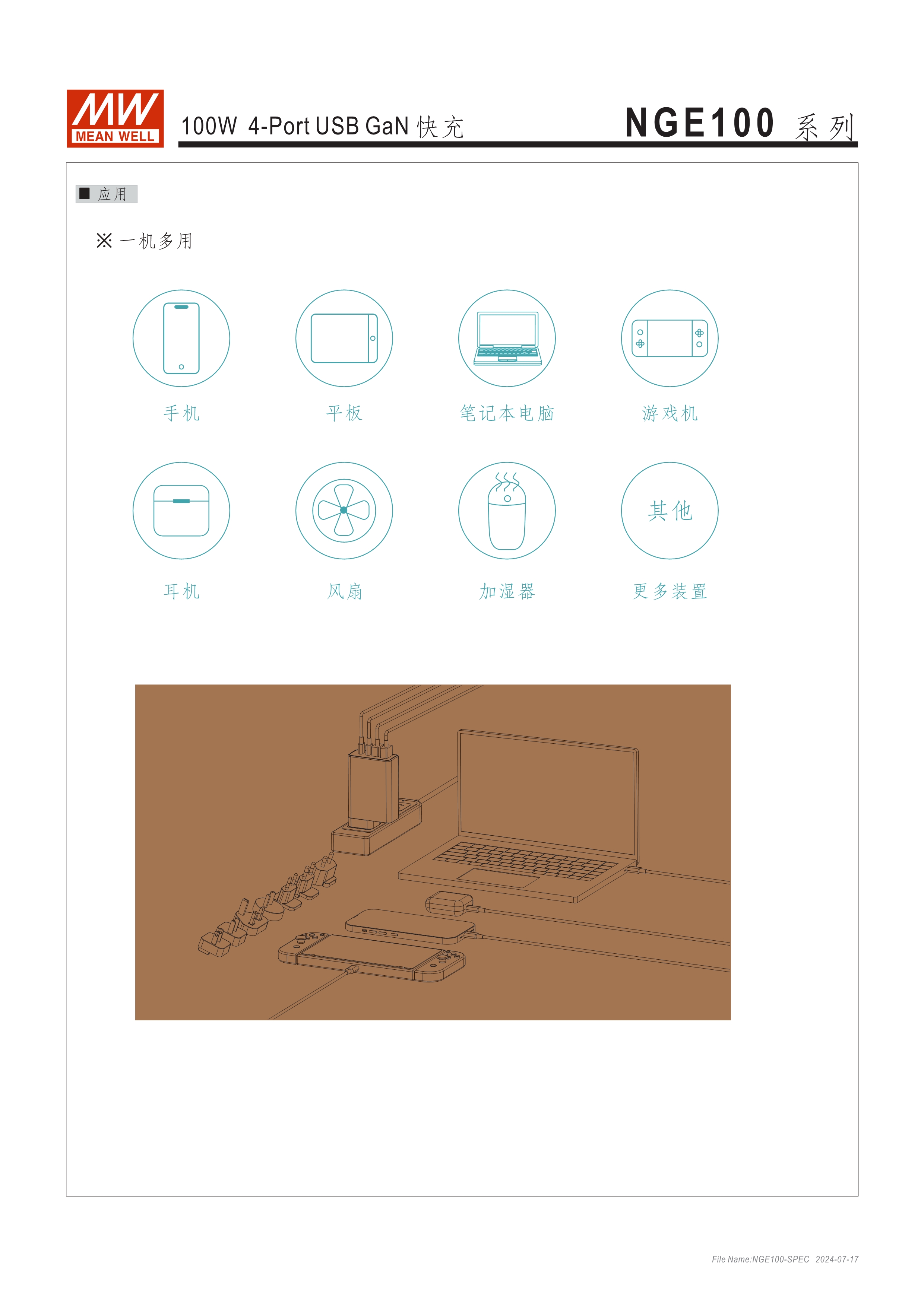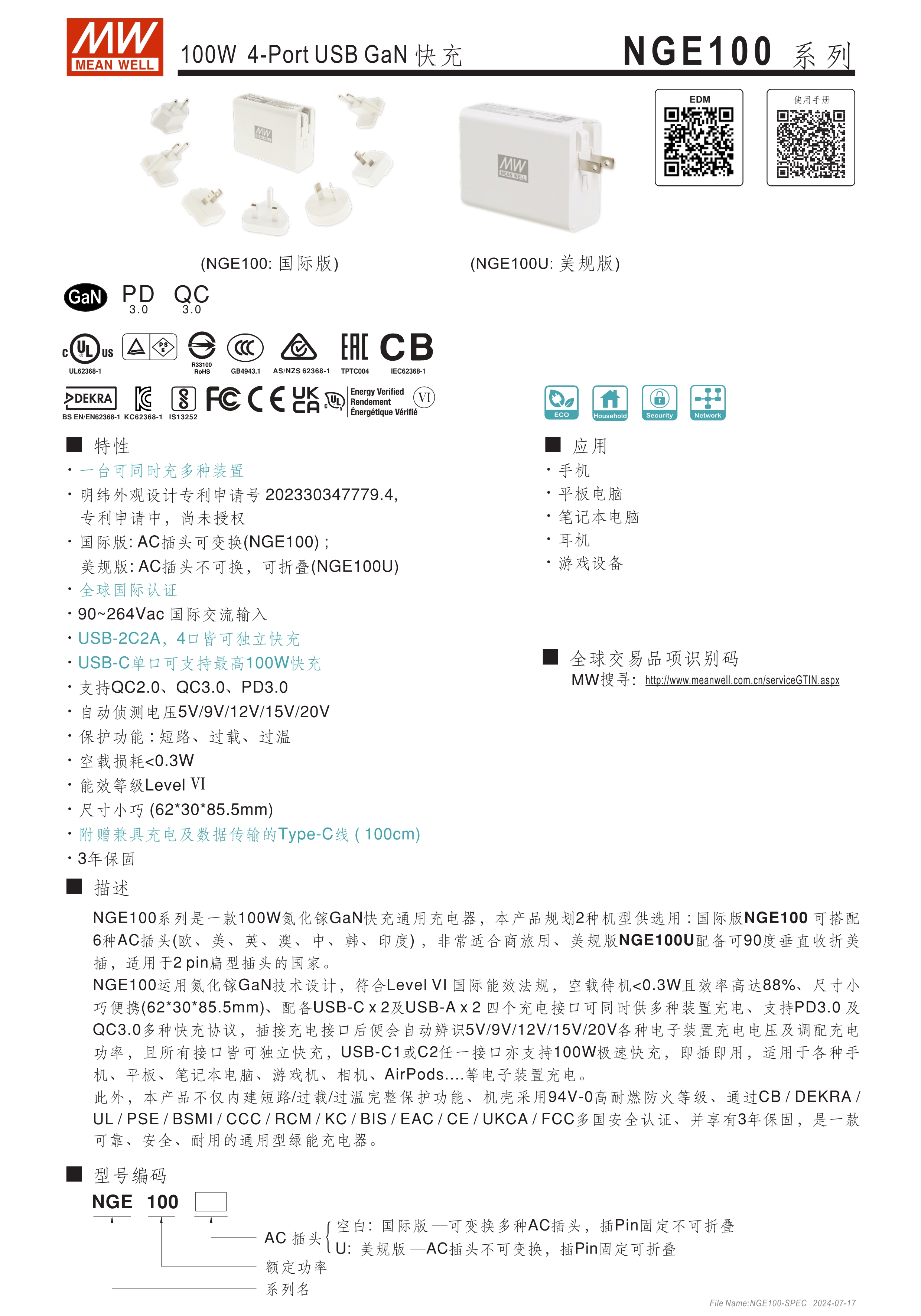 一臺(tái)可同時(shí)充多種裝置 國(guó)際版: AC插頭可變換(NGE100); 美規(guī)版: AC插頭不可換,可折疊(NGE100U) 全球國(guó)際認(rèn)證 USB-2C2A,4-Port皆可獨(dú)立快充 USB-C單port可支援最高100W快充 支援QC2.0、QC3.0、PD3.0 自動(dòng)偵測(cè)電壓:5V/ 9V/ 12V/ 15V/ 20V 保護(hù)功能 : 短路、過載、過溫 空載損耗<0.3W 能效等級(jí)Level VI 尺寸小巧 (62x 30x 85.5mm) 附贈(zèng)兼具充電及資料傳輸?shù)腡ype-C線 (100cm) 3年保固