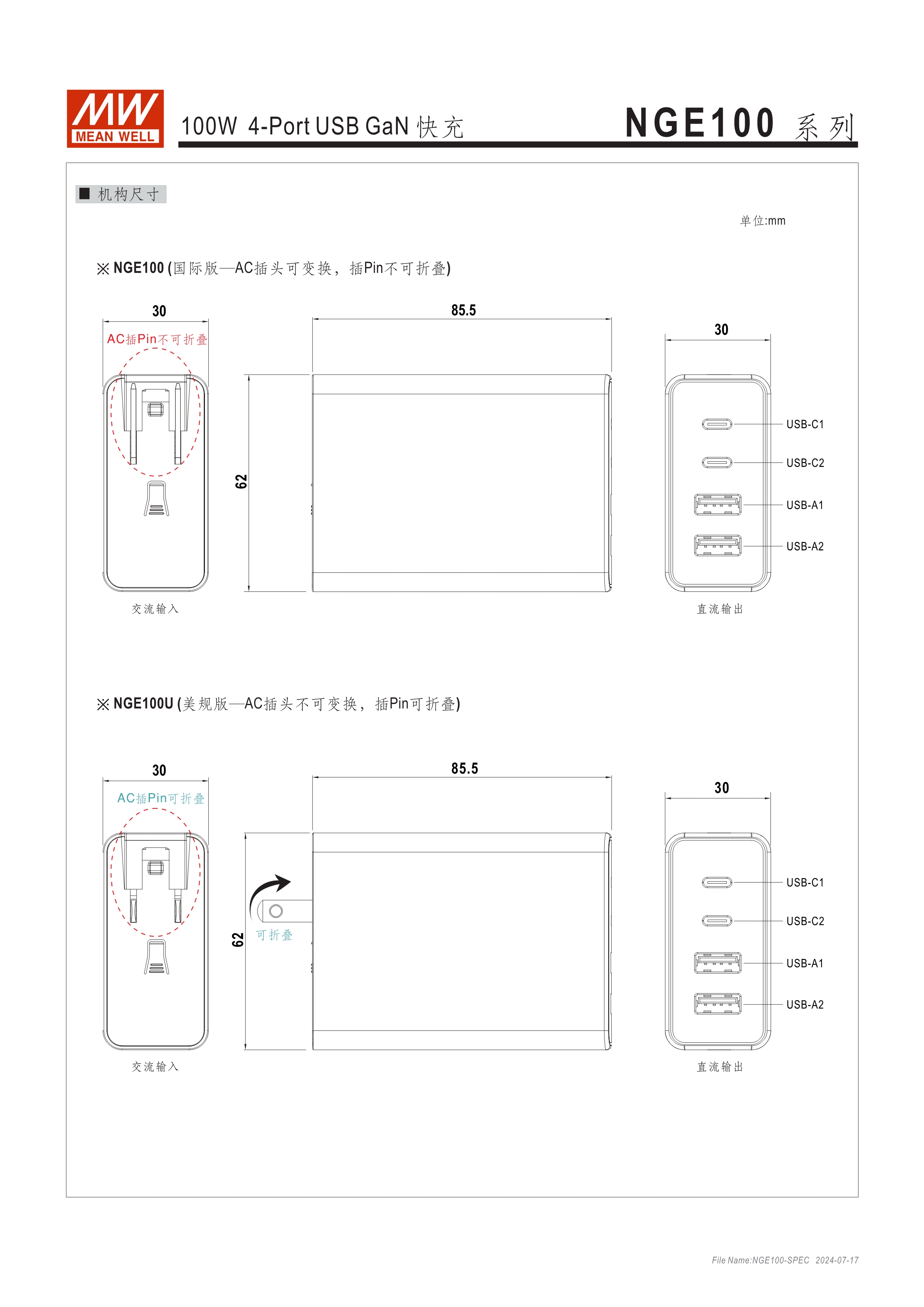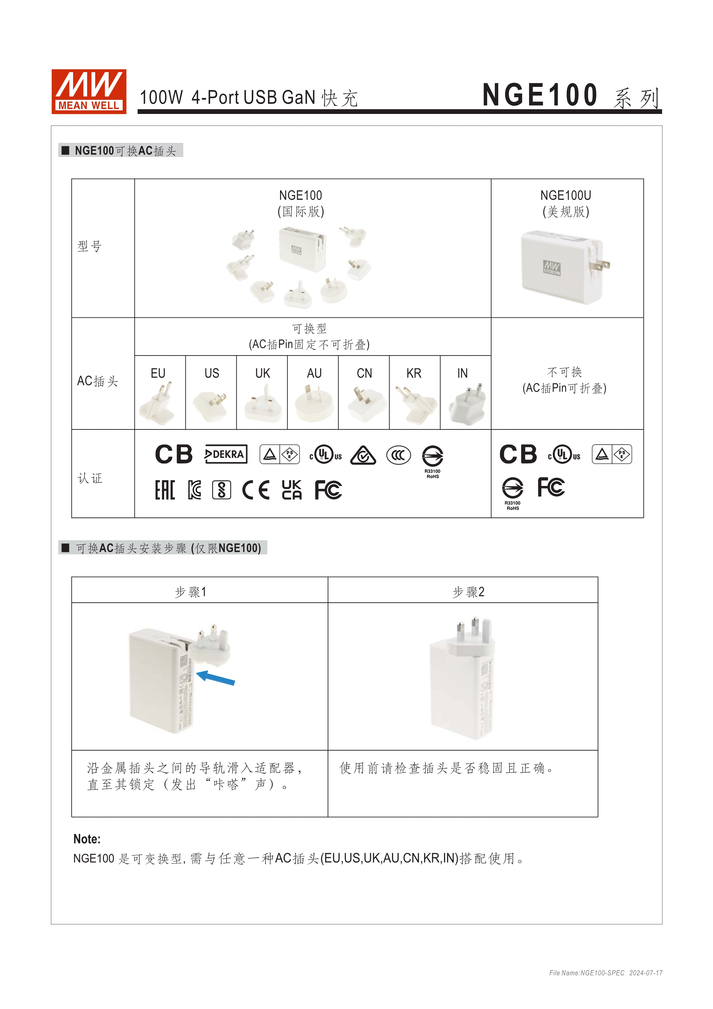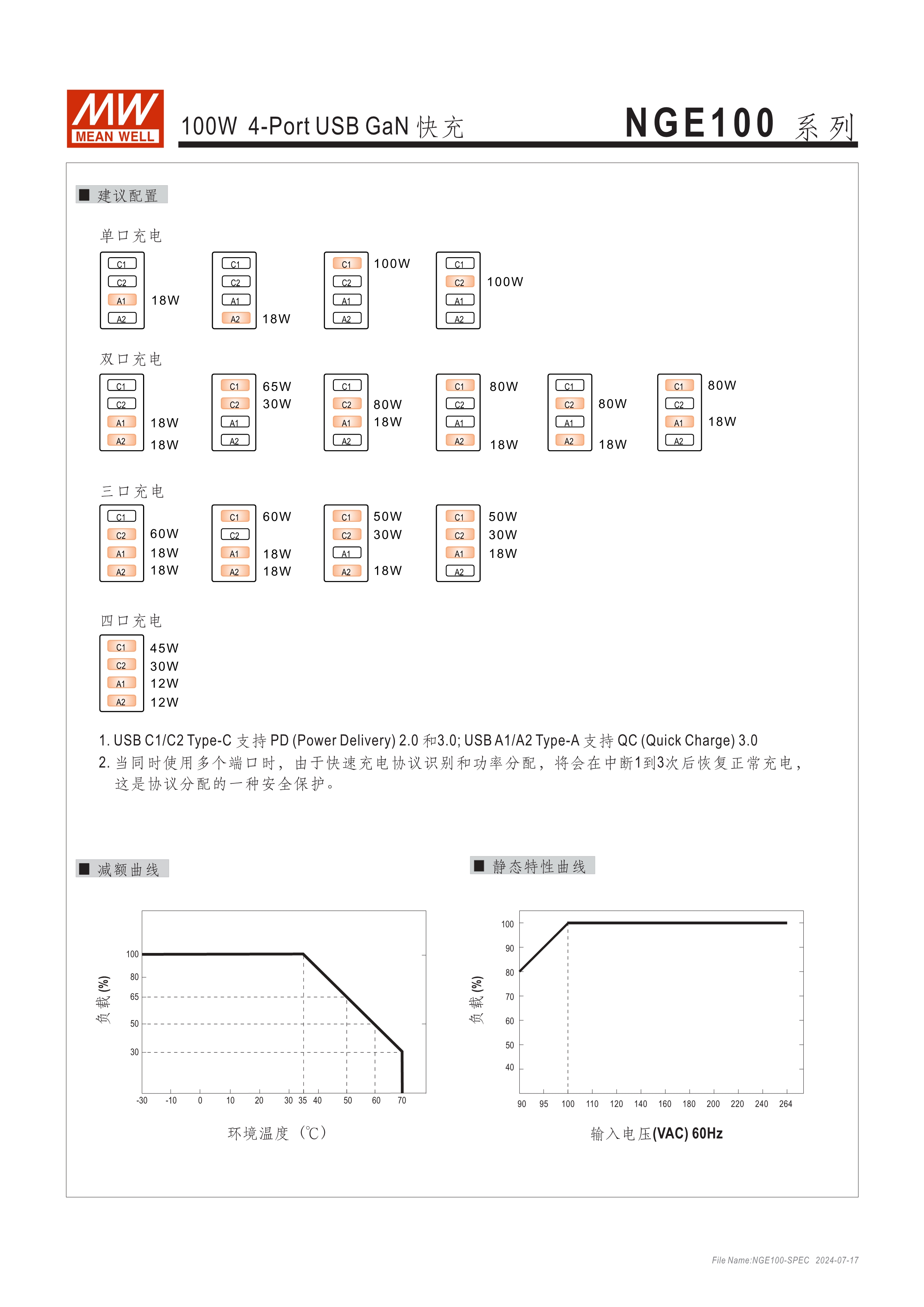 一臺(tái)可同時(shí)充多種裝置 國(guó)際版: AC插頭可變換(NGE100); 美規(guī)版: AC插頭不可換,可折疊(NGE100U) 全球國(guó)際認(rèn)證 USB-2C2A,4-Port皆可獨(dú)立快充 USB-C單port可支援最高100W快充 支援QC2.0、QC3.0、PD3.0 自動(dòng)偵測(cè)電壓:5V/ 9V/ 12V/ 15V/ 20V 保護(hù)功能 : 短路、過載、過溫 空載損耗<0.3W 能效等級(jí)Level VI 尺寸小巧 (62x 30x 85.5mm) 附贈(zèng)兼具充電及資料傳輸?shù)腡ype-C線 (100cm) 3年保固