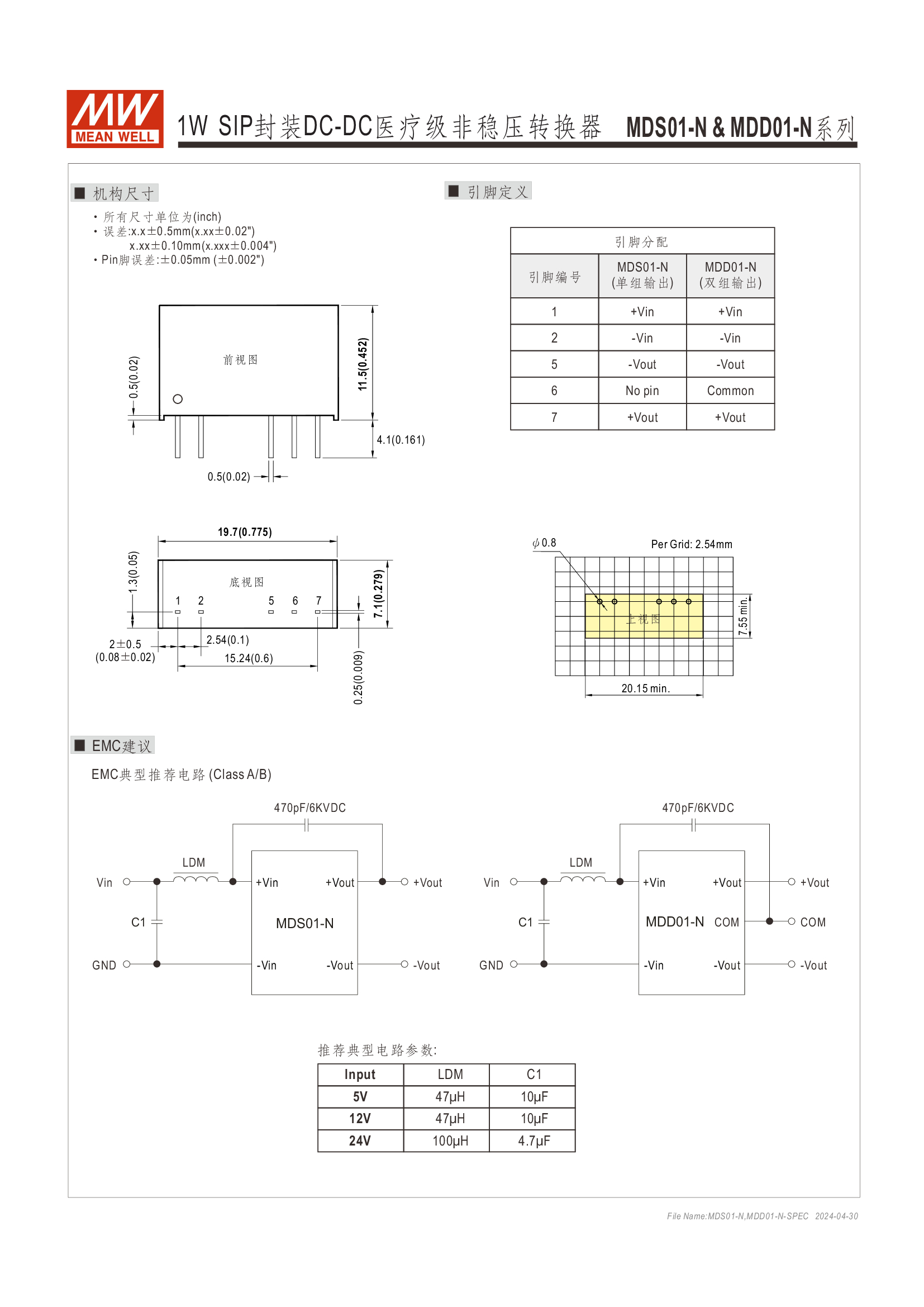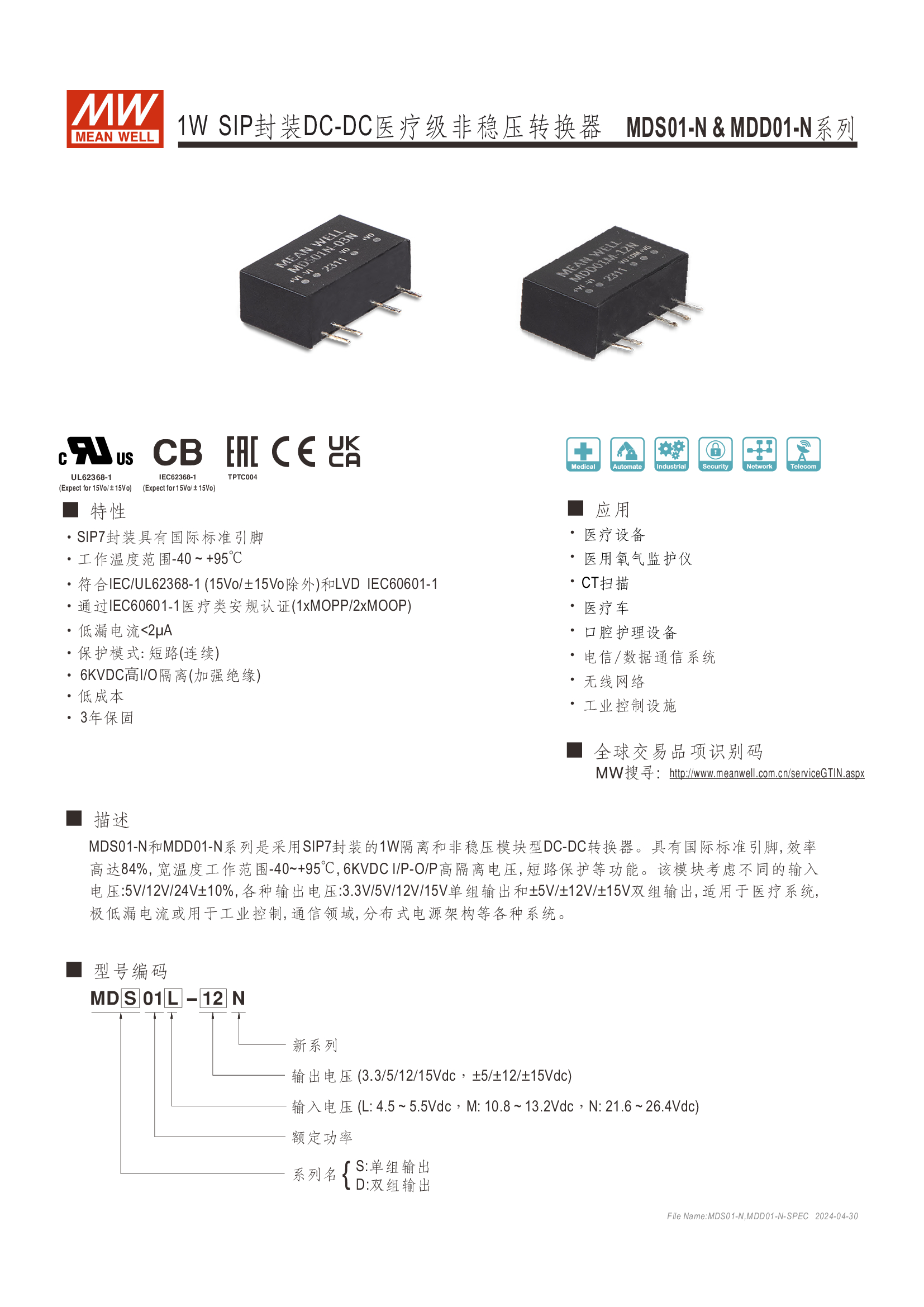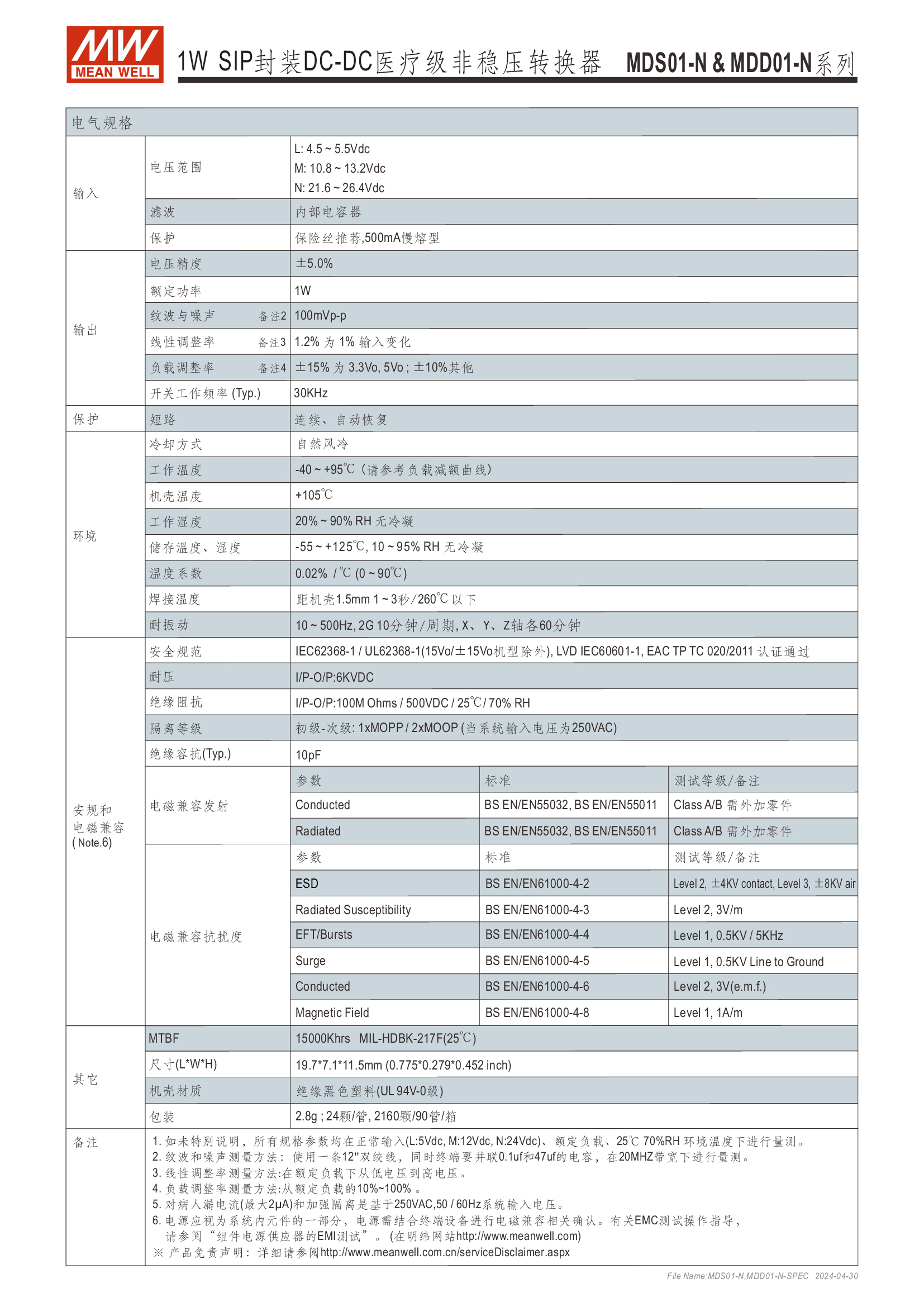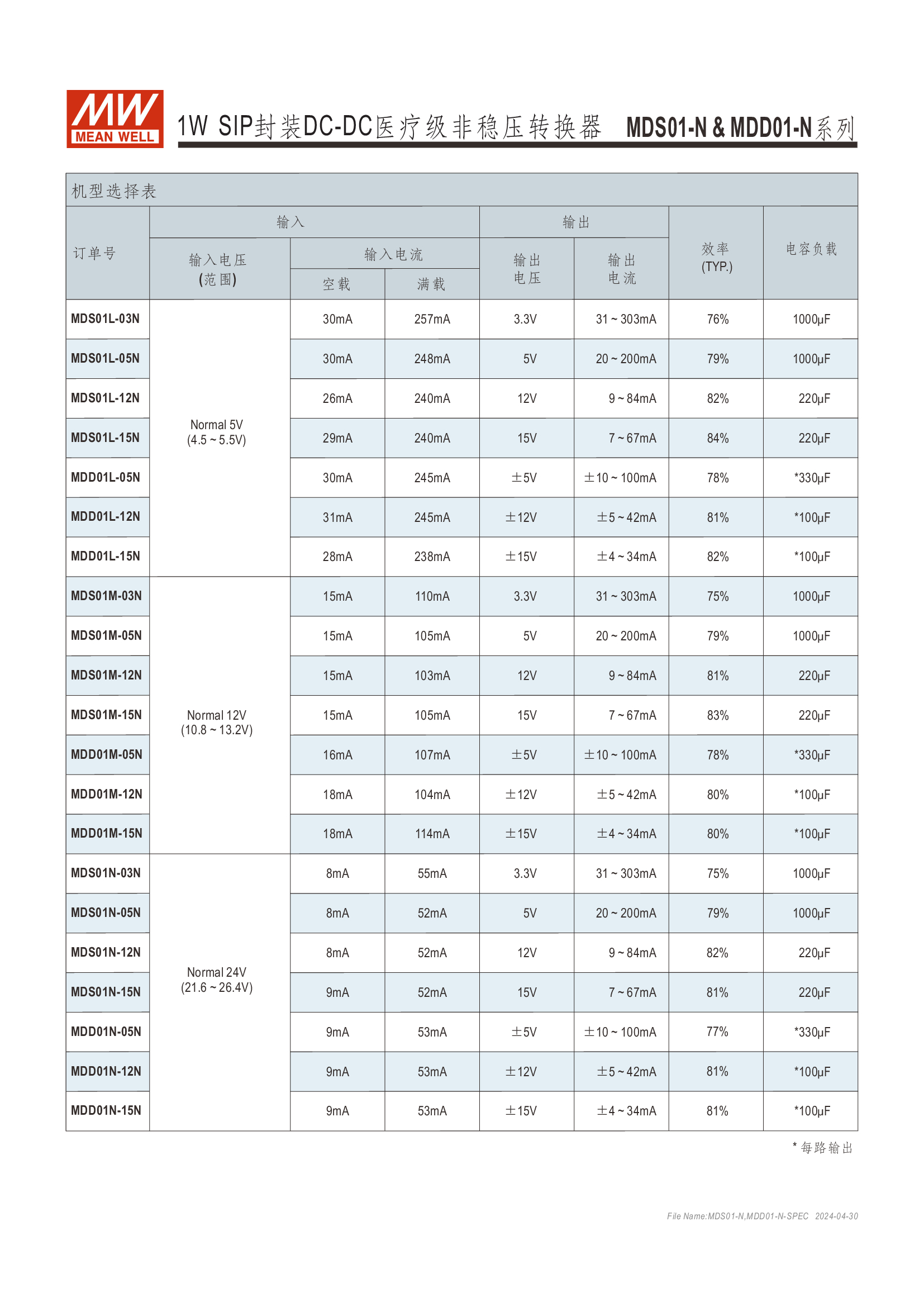 模塊型快選表 SIP7 單排封裝國(guó)際標(biāo)準(zhǔn)引腳 (1~3W); DIP24 單排封裝國(guó)際標(biāo)準(zhǔn)引腳 工作溫度:-40 ~ +90℃ (不需降載) 通過(guò)醫(yī)療認(rèn)證ANSI/AAMI ES60601-1 (1×MOPP/2×MOOP) 超低病患泄漏電流 <2μA(1~3W); 超低病患泄漏電流 <5μA (3~6W) 保護(hù)功能:短路保護(hù)(3秒) / 過(guò)負(fù)載保護(hù) (3~6W) 3年保固期