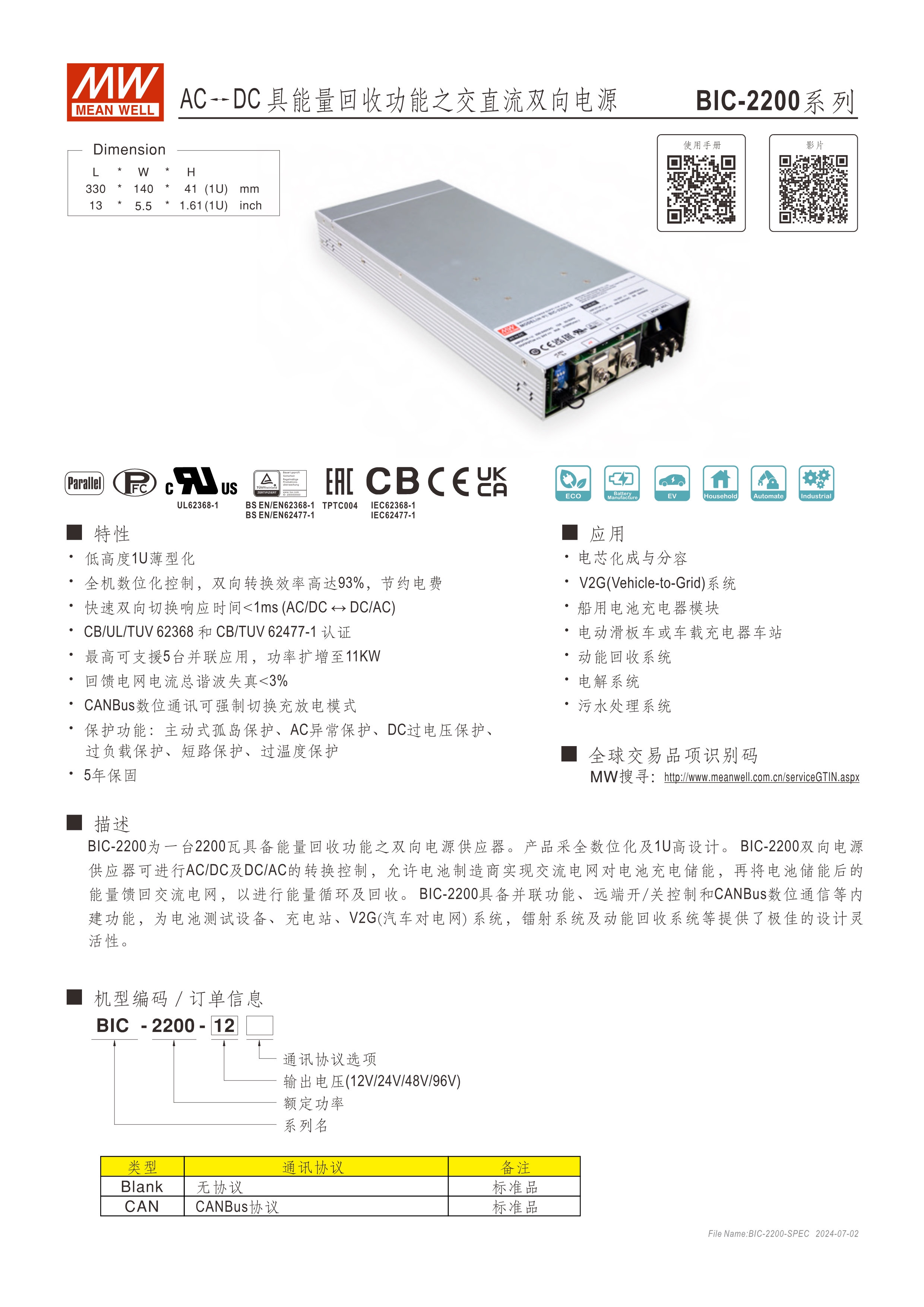 系統(tǒng)電源解決方案 (PDF) 低高度1U薄型化設(shè)計 全機數(shù)字化控制,雙向轉(zhuǎn)換效率高達93% 快速雙向切換響應(yīng)時間<1ms (AC/DC ? DC/AC) CB/UL/TUV 62368法規(guī)認證,電路設(shè)計符合IEC 62477法規(guī) 最高可支持5臺并聯(lián)應(yīng)用,功率擴增至11kW 回饋電網(wǎng)電流總諧波失真<3% 數(shù)字通訊可強制切換充放電模式(選配CANBus機型) 保護功能:主動式孤島保護、AC異常保護、DC過電壓保護、過負載保護、短路保護、過溫度保護 5年保固