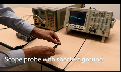 在S.P.S.漣波噪聲中含有2 種成分,一是交流輸入電壓的倍頻頻率,另一為S.P.S.本身的切換頻率。由于是高頻噪聲,在量測時,示波器帶寬應(yīng)設(shè)在20MHz,且探棒應(yīng)以最短距離來量測;并在待測端加一小電容(0.1uF)來濾除噪聲干擾,如下圖所示。